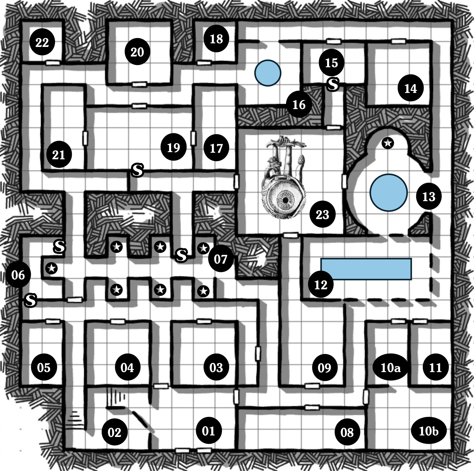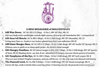 This 23-room dungeon villa tasks the PCs with finding a way to escape the powerful geas that holds them prisoner. They will have to navigate the dead that the geas won't let rest, hungry familiars angry at their abandonment, candle-wax doves that hate light, and a dream-mad lord stalking the halls. All the while, they will puzzle over the tria prima, bemoan a mask made of cheese, tame a desk with a nasty disposition, and ponder the black lacquor box below the alien monstrosity at the center of the villa.